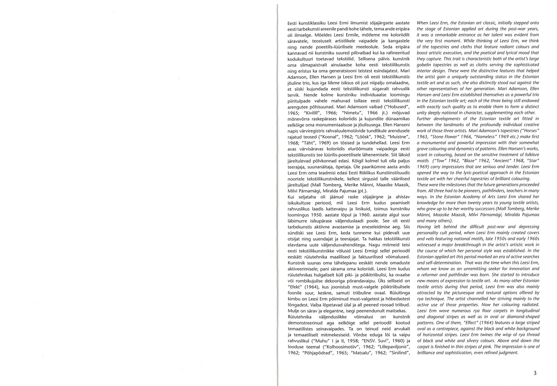 Riigi Kunsttööstuskooli tekstiilieriala lõpetanud ja lisaks kangakudumist tudeerinud Leesi Erm alustas näitustel esinemist 1939. aastal. Silmapaistva loomingulise tegevuse eest pälvis ta ENSV rahvakunstniku aunimetuse. Oma teadmisi andis ta edasi üle kahekümne aasta edasi ka ERKI tekstiilikunsti eriala üliõpilastele. Tema suuremalt jaolt nõukogude võimu valvsa pilgu all valminud ainuomase käekirjaga looming saavutas kõrge kunstilise ning tehnilise taseme. Viie aastakümne jooksul loodud vaipadelt ja kangastelt võib välja lugeda Eesti tarbekunsti ajastuomaseid muutusi. Kataloog kaasneb samanimelise näitusega.