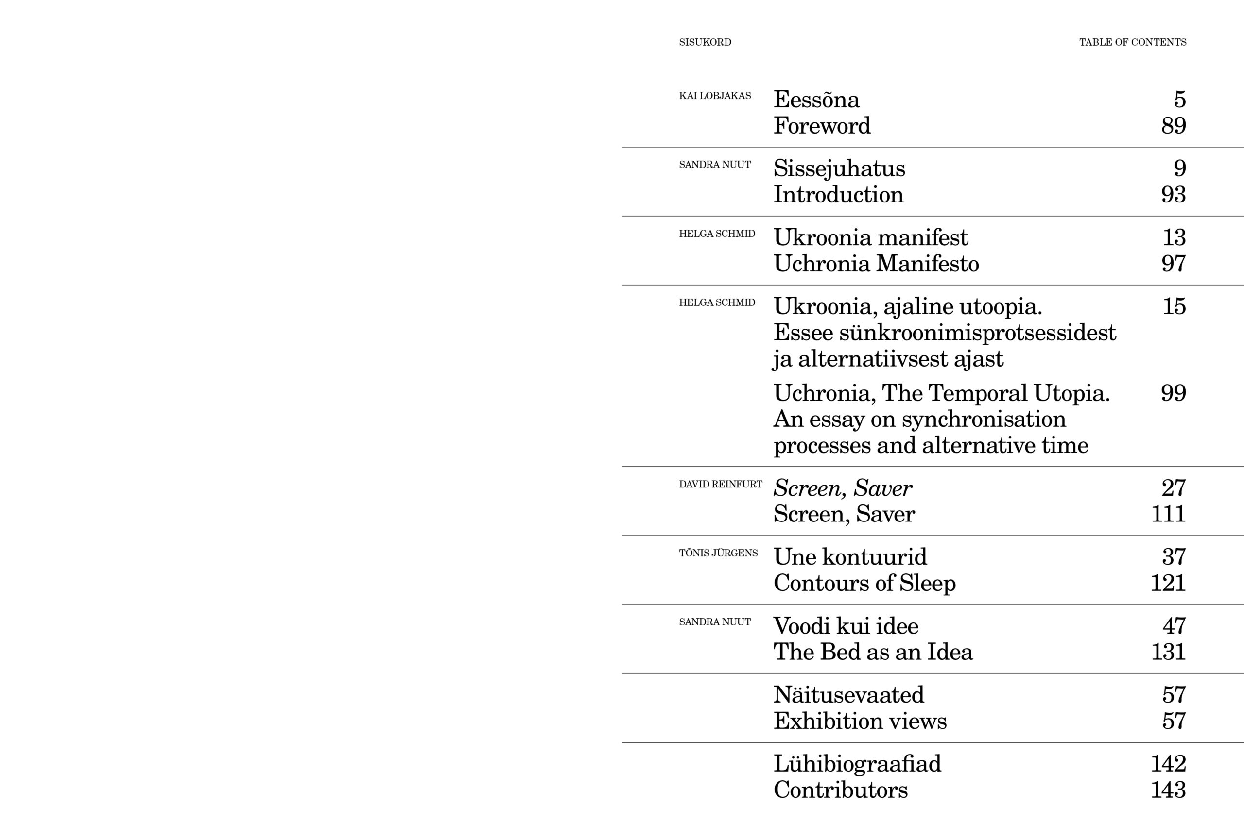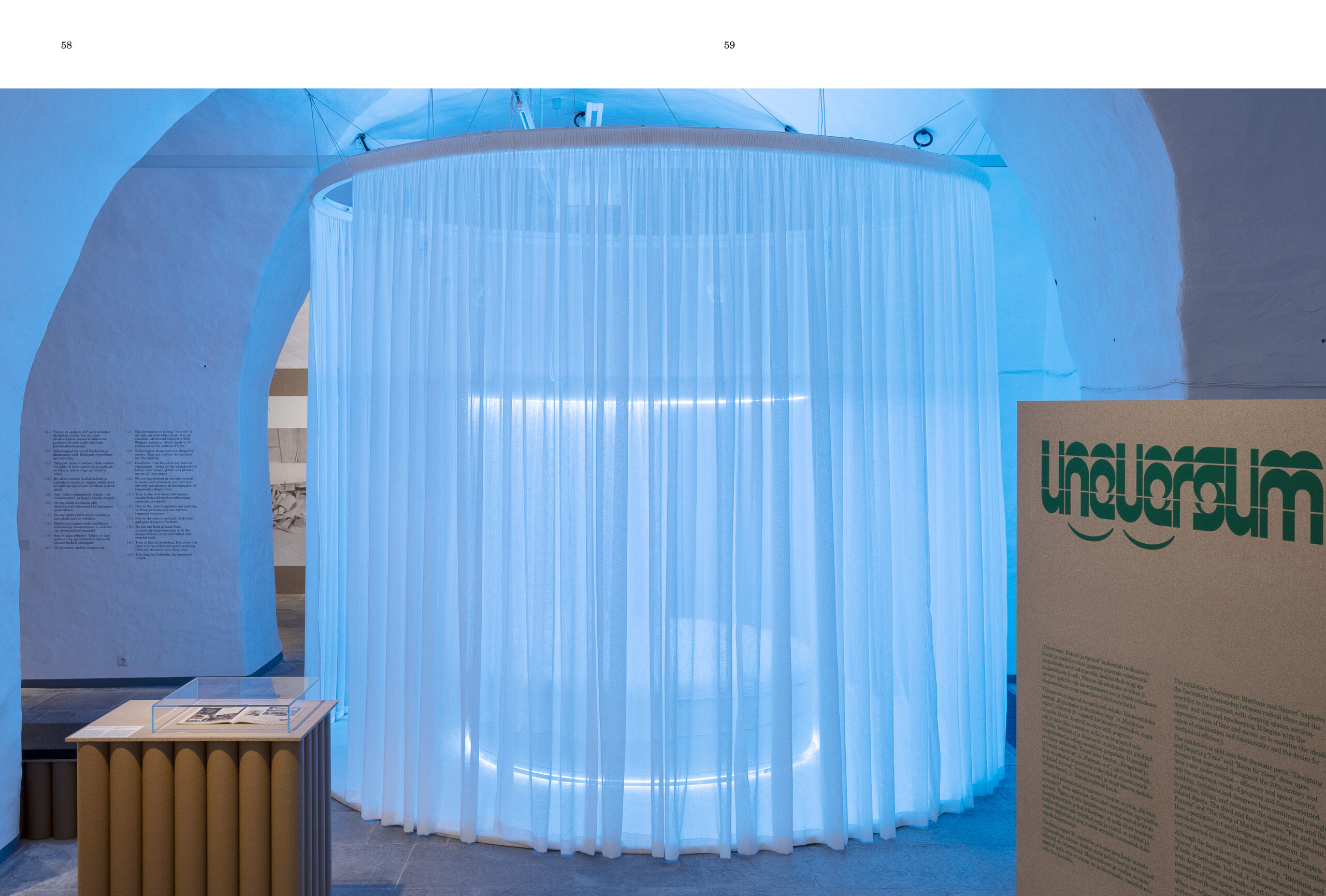 Trükis “Uneversum. Rütmid ja ruumid” kaasneb samanimelise näitusega, mis oli avatud 27.10.2023–7.04.2024. Kui näitus keskendub radikaalsete ideede ja traditsioonilise igapäeva põnevale vahekorrale magamiseks mõeldud ruumide, keskkondade ning aja ja ajanäitajate kaudu, siis trükises avavad mõned näitusel osalenud kunstnikud, disainerid ja kirjutajad näituse eri tahke, lähtudes oma tegevusvaldkonnast ja uurimusest. Trükis koondab “Ukroonia manifesti” ja nelja pikemat esseed, nagu Helga Schmidi “Ukroonia, ajaline utoopia. Essee sünkroonimisprosessidest ja alternatiivsest ajast”, David Reinfurti “Screen, saver”, Tõnis Jürgensi “Une kontuurid” ja Sandra Nuudi “Voodi kui idee”. Lisaks artiklitele on trükises Anu Vahtra pildistatud valik näitusevaateid.